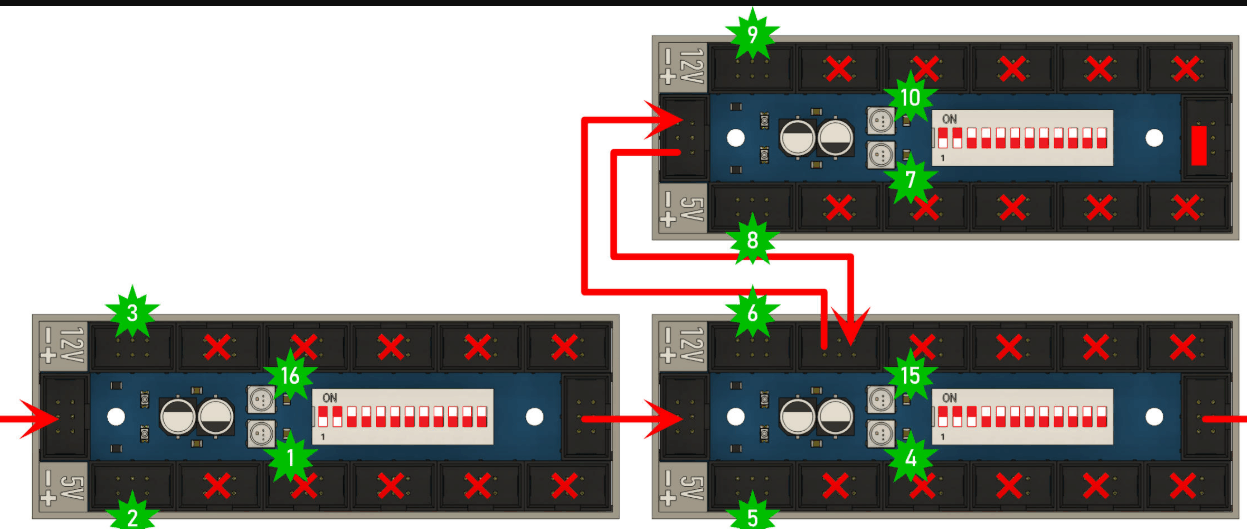 Wenn nur ein Verteiler benutzt wird wie in Deiner Frage, muss auch das Datensignal in der Wanne rechts außen per Jumper überbrückt werden. Die Position des Jumpers ist auf der Platine und dem Gehäuse markiert.