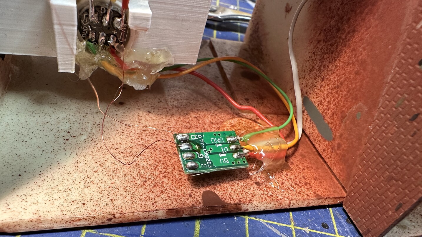 Raum 1-3 werden durch je eine WS2812B beleuchtet, die Außenleuchte (1 SMD-LED) hängt am Kanal R eines WS2811 (Schokotafel).