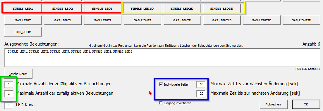 Dann die Anzahl der min. und max. LED's auf 1 setzen (siehe grün) und die Zeit zur nächsten Änderung setzen (blau).
