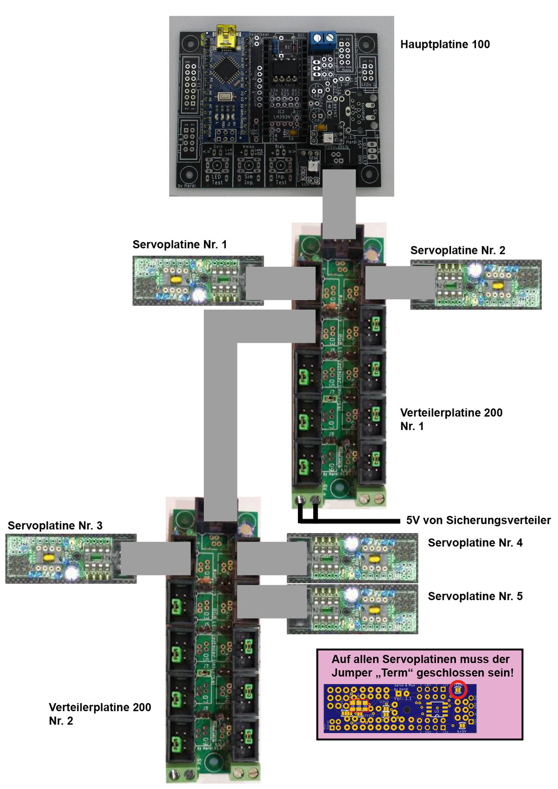 Tausche ich die Kabel am Verteiler 1 WS 3 und WS 4 kann ich die Servoplatine 5 erreichen, aber dafür nicht mehr das was an der Verteilerplatine 2 hängt.