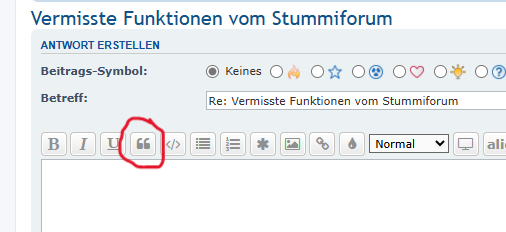Ich markiere mir die Stelle Strg C: Dann gehe ich auf Antworten und drück den Zitieren Button: Danach erscheint das hier mit blinkenden Cursor in der Mitte: Dann Strg V: Und dann erscheint es so im Beitrag: